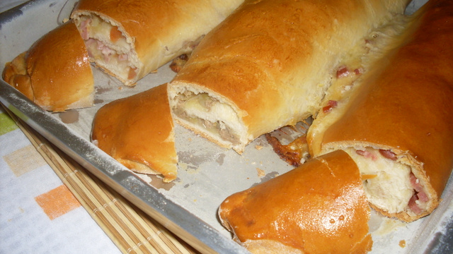 Divida em 2 ou 3 partes, dependendo do quanto a massa cresceu, abra, espalhe a mussarela e depois coloque por cima o resto dos ingredientes do recheio.