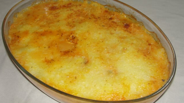 Forre o fundo da travessa com a metade do purê.