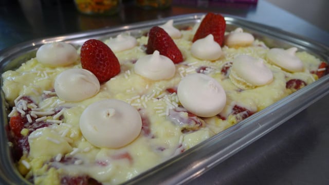 No fundo do prato, cubra com metade do morango , suspiro, suco de laranja , mais morango e depois com o restante do creme de baunilha.