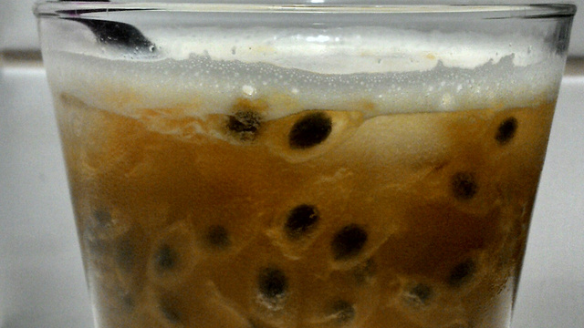 Corte o maracujá ao meio, retire a polpa e as sementes.
