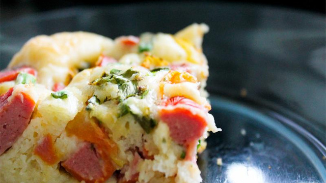 Unte uma forma, jogue a metade da massa, acrescente a salsicha picada e os outros ingredientes do recheio.