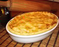 Forre uma forma com a massa (abra-a com a mão), coloque o recheio, e cubra com o restante de massa.