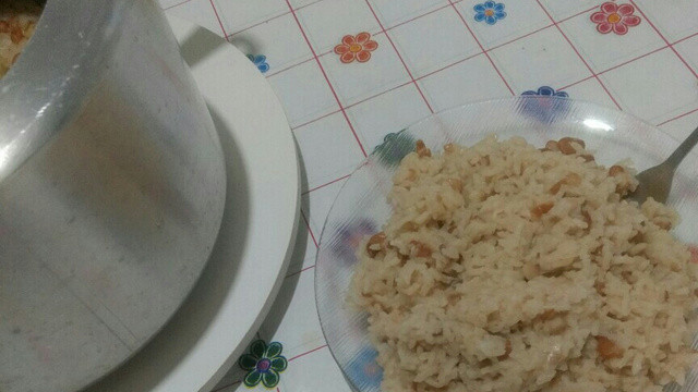 Depois do arroz refogado, acrescente o feijão (cozido) e continue mexendo.