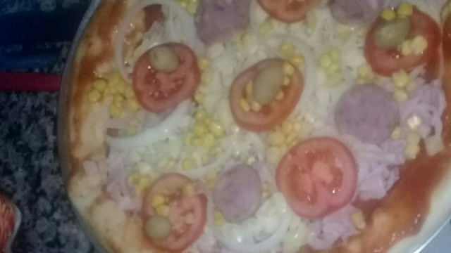 Depois coloque a mussarela, o milho, a ervilha, o palmito, a calabresa, azeitonas e o orégano.