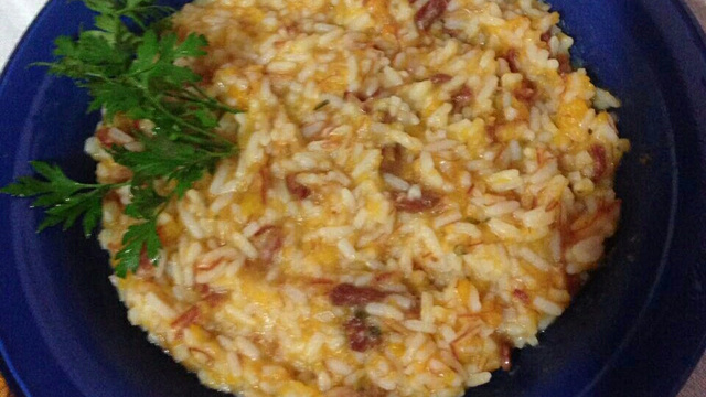 Coloque o risoto no prato fundo no centro e os fios de carne seca e sirva.