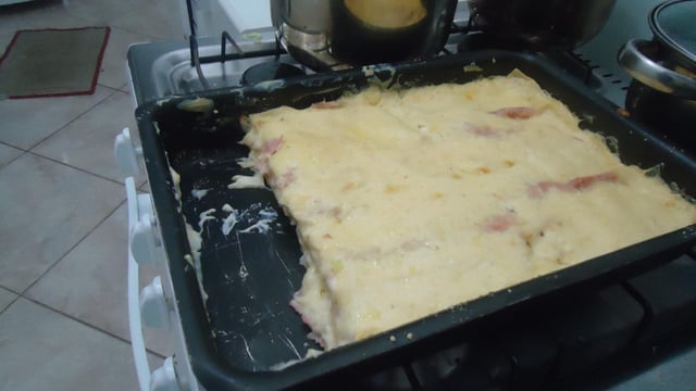 Depois é só montar a lasanha colocar a massa, molho, presunto, mais molho, massa, molho, mussarela, molho e assim até o fim. Colocando por último molho de queijo ralado. Levar ao forno até o queijo derreter.