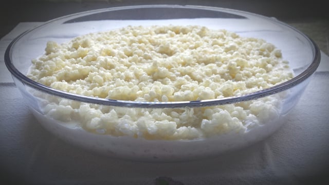 Coloque a tapioca em um refratário e adicione o leite.