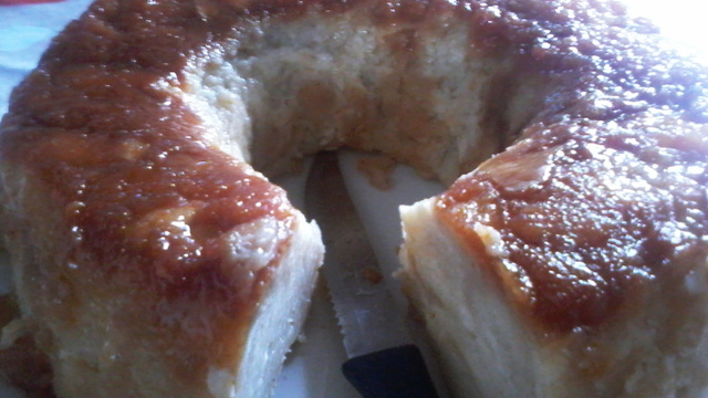 Obs.: Use uma forma grande, a mistura deve ocupar um pouco mais da metade da forma, pois o pudim cresce por conta do fermento do pão e pode derramar no forno. Espere ficar morno e abaixar novamente antes de desenformar.