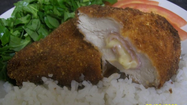 Faça rolinhos de presunto e queijo e introduza dentro dos filés.