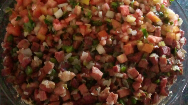 Por último misture o feijão, o charque e a farinha, não muito, para não ficar seco.