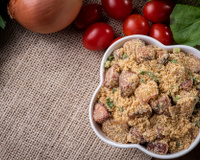 Depois de frito e dourado coloque a margarina e a cebola, quando a margarina derreter totalmente coloque a farofa pronta.