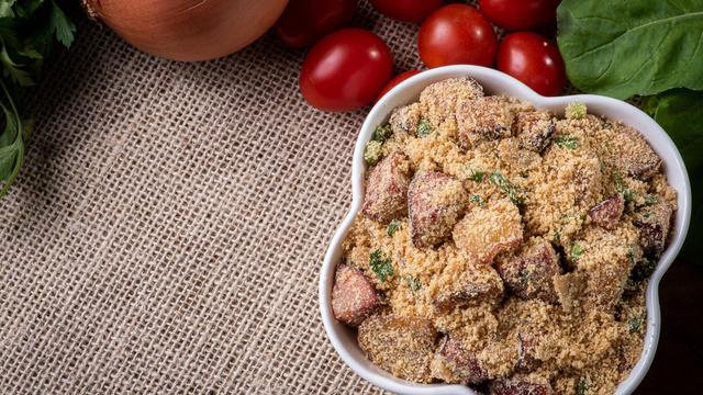 Se desejar uma farofa mais molhadinha coloque mais margarina, misture tudo, apague o fogo e coloque o cheiro verde bem picadinho.