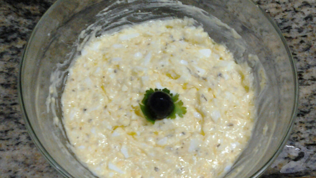 Cozinhe bem os ovos e pique bem as gemas em separado das claras.