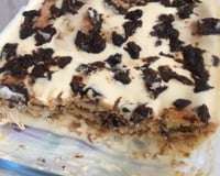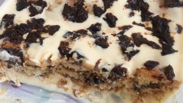Umedeça os biscoitos na calda das ameixas reservada e distribua em um refratário, formando camadas com o creme, as ameixas e os biscoitos.
