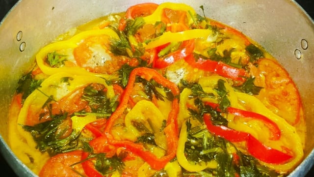 Passe um pouco de azeite de oliva na Agdá e forre com camadas de cebola, tomate e pimentão, alternando com as postas de peixe.