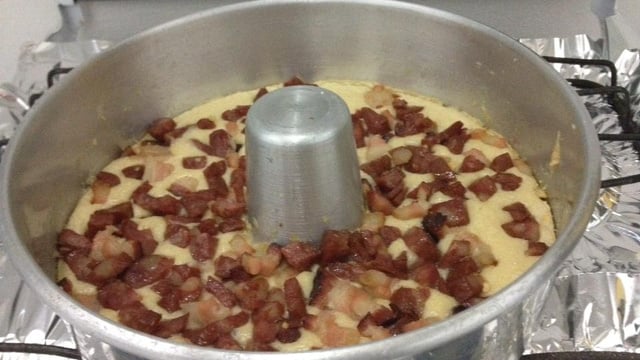 Depois colocar a mistura do liquidificador em um recipiente e misturar com o bacon e a linguiça (o bacon e a linguiça devem ser fritos antes).