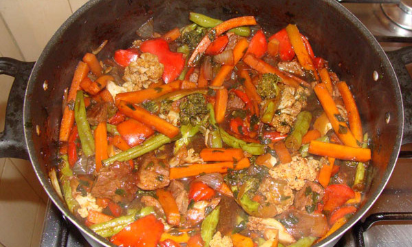 Escorra os legumes, e junte na panela, coloque o shoyu, misture bem (se quiser, pode colocar um pouco de água), tampe a panela e deixe até os legumes amolecerem, mas continuarem al dente, mexa sempre.