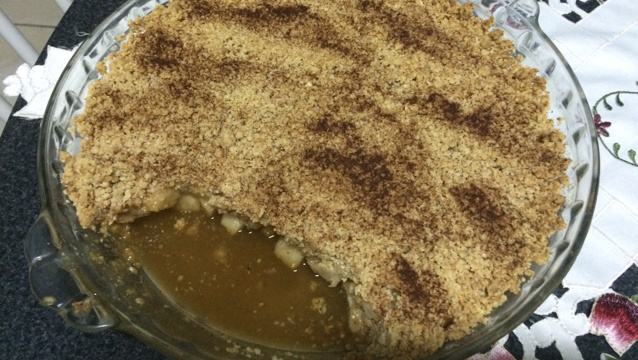 Coloque as frutas em uma travessa (que possa ir ao forno) e cubra com a mistura.