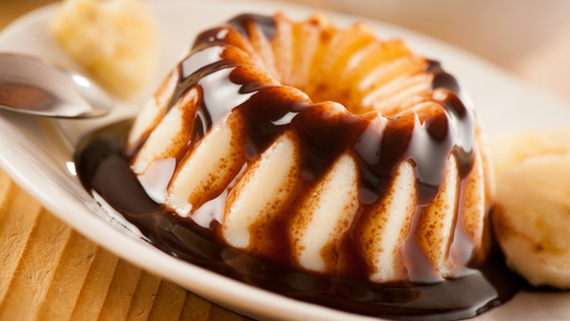 Umedeça uma forma para pudim e despeje o creme, deixe-o esfriar e leve-o à geladeira coberto por uma folha de papel-alumínio.
