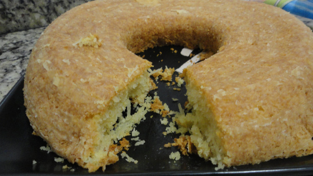 Asse em forma de buraco no meio, untada e enfarinhada, em forno moderado, pré-aquecido, por uns 30 minutos, ou até que enfiando um palito este saia limpo.