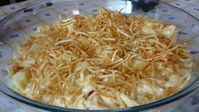 Retire da panela, coloque em uma forma (marinex) e cubra com a batata palha.