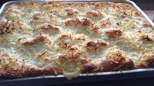 Unte uma forma retangular grande e coloque a massa do bolo, por cima da massa ainda crua coloque o creme reservado, por cima 1 pacote de coco ralado.