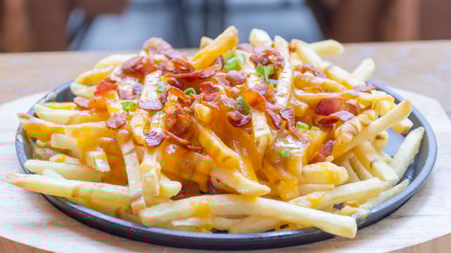 Despeje por cima das batatas e polvilhe com o bacon.