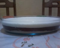 Coloque a primeira massa numa travessa, depois a segunda com a mistura de chocolate e, por último, as claras batidas em neve com 4 colheres de açúcar e uma lata de creme de leite.