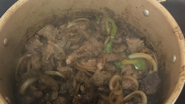 Frite a carne no óleo e só depois com a carne ainda no fogo baixo acrecente o alho picado, em seguida a cebola, em seguida o pimentão com a pimenta de cheiro.