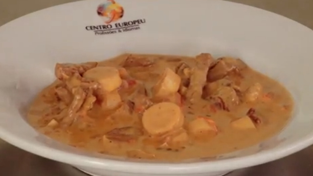 Refogar a cebola e a manteiga em seguida coloque a carne cortada em tiras pequenas, coloque o caldo de carne e deixe refogar bem.