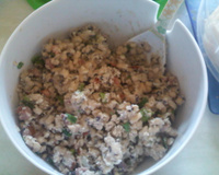 Escalde o charque, e a carne-do-sol. Corte as carnes em pedacinhos pequenos a linguiça e frite na manteiga de garrafa em uma frigideira grande.