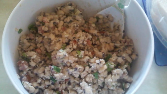 Misture o feijão acrescente a farinha de mandioca, acrescente os tomates picados e sem sementes, o pimentão picado e por fim o coentro picado.