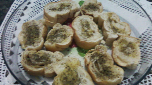 Corte o pão em fatias grossas e coloque azeite e óregano por cima das fatias. Leve no microondas na potência alta por 3 minutos.
