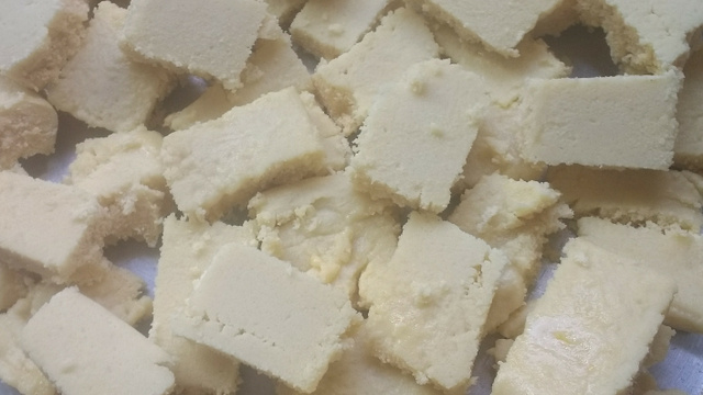 Antes que massa esfrie por completo, corte em quadradinhos com 5 cm de lado.