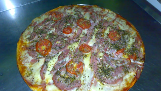 Acrescente o recheio na seguinte ordem: molho de tomate, mussarela, bacon, azeitonas e por último o orégano.