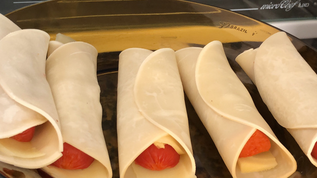 Depois de aferventar e escorrer as salsichas, corte as salsichas ao meio, pincele água nas pontas do disco de massa.