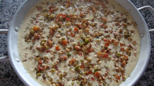 Coloque toda a mistura do liquidificador na assadeira untada e coloque o recheio, distribundo bem.