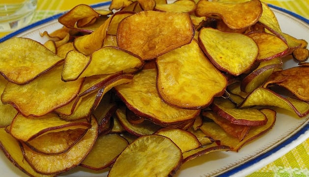 Descasque as batatas e corte em rodelas. Frite em óleo quente, o suficiente para cobri-las.