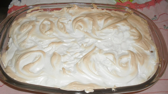 Espalhe sobre o creme, fazendo picos com as costas de uma colher e leve ao forno alto, pré-aquecido, por 5 minutos, ou até dourar.