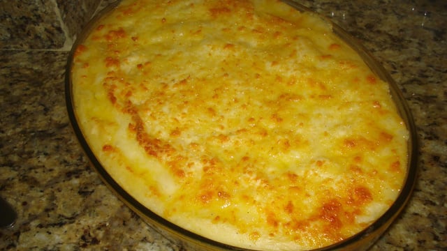 Em um refratário grande espalhe metade do purê, rechei com a carne e um pouco do queijo, cubra com o restante do pure, salpique o queijo e leve ao forno pré-aquecido acima de 180°C por aproximadamente 40 minutos.