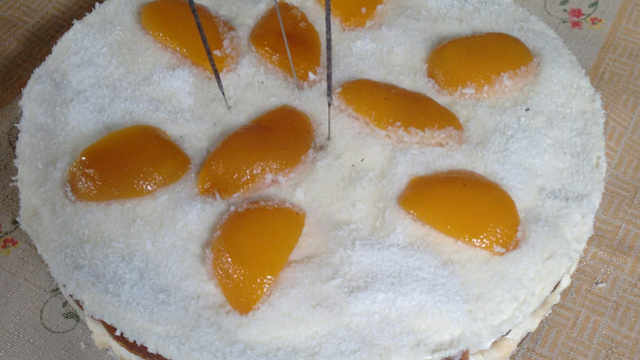 Por último polvilhe bastante coco ralado por cima e decore com cerejas, morangos, pêssegos, o que gostar mais.