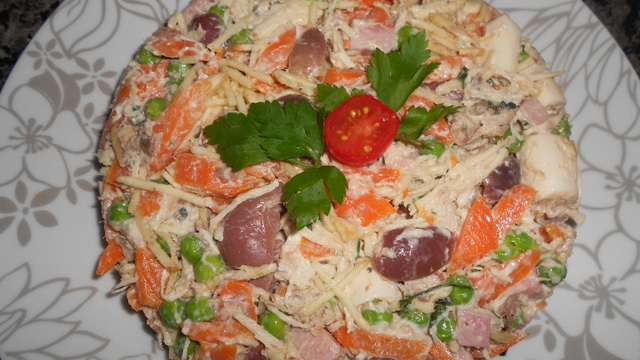 Coloque numa vasilha grande os ingredientes (cenoura, azeitona, peito de frango picado, palmito, uva passas, cheiro-verde, coentro). Tempere com bastante azeite, sal e limão, por último coloque a batata palha e a maionese, misture bem tudo.