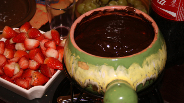 Derreta o chocolate em banho-maria no próprio recipiente para fondue.