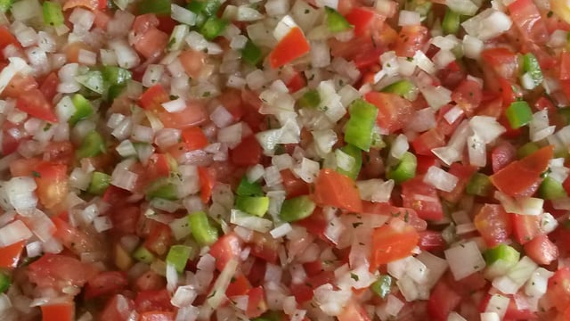 Corte em cubinhos pequenos os tomates, o pimentao e cebola.