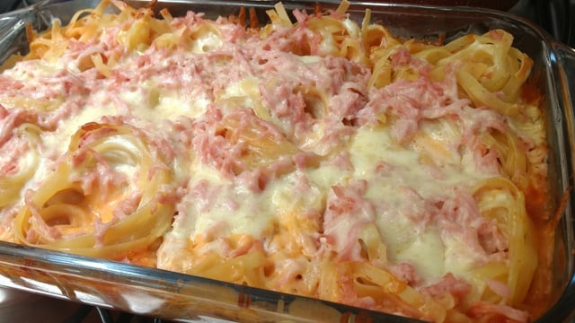 Forrar com o queijo e o presunto e tampar o refratário com o papel laminado.