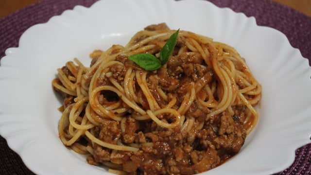 Despeje o molho de tomate quente sobre o espaguete, distribuindo uniformemente por todo o macarrão.