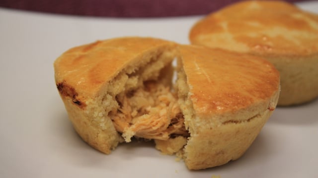 Com o restante da massa, faça tampinhas e cubra as empadas. Pincele a gema e arrume-as numa assadeira.