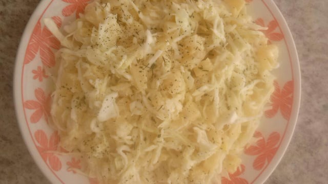 Lave o repolho com água potável e fria, deixe-o escorrer bem. Misture-o com abacaxi. Misture a maionese, o creme de leite, o vinagre, a mostarda, o açúcar e o sal. Incorpore este molho ao repolho e ao abacaxi. Deixe esfriar na geladeira e misture novamente antes de servir.