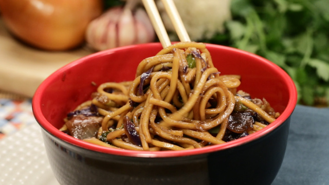 Coloque o molho para yakissoba e deixe cozinhar até os legumes ficarem cozidos.