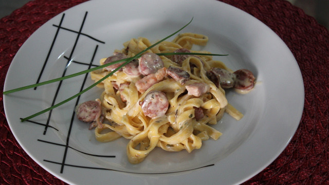 Esquente um pouco de água e jogue em cima do macarrão, para soltá-lo e esquentá-lo. Sirva o macarrão e o molho.